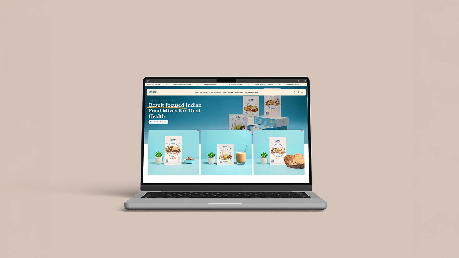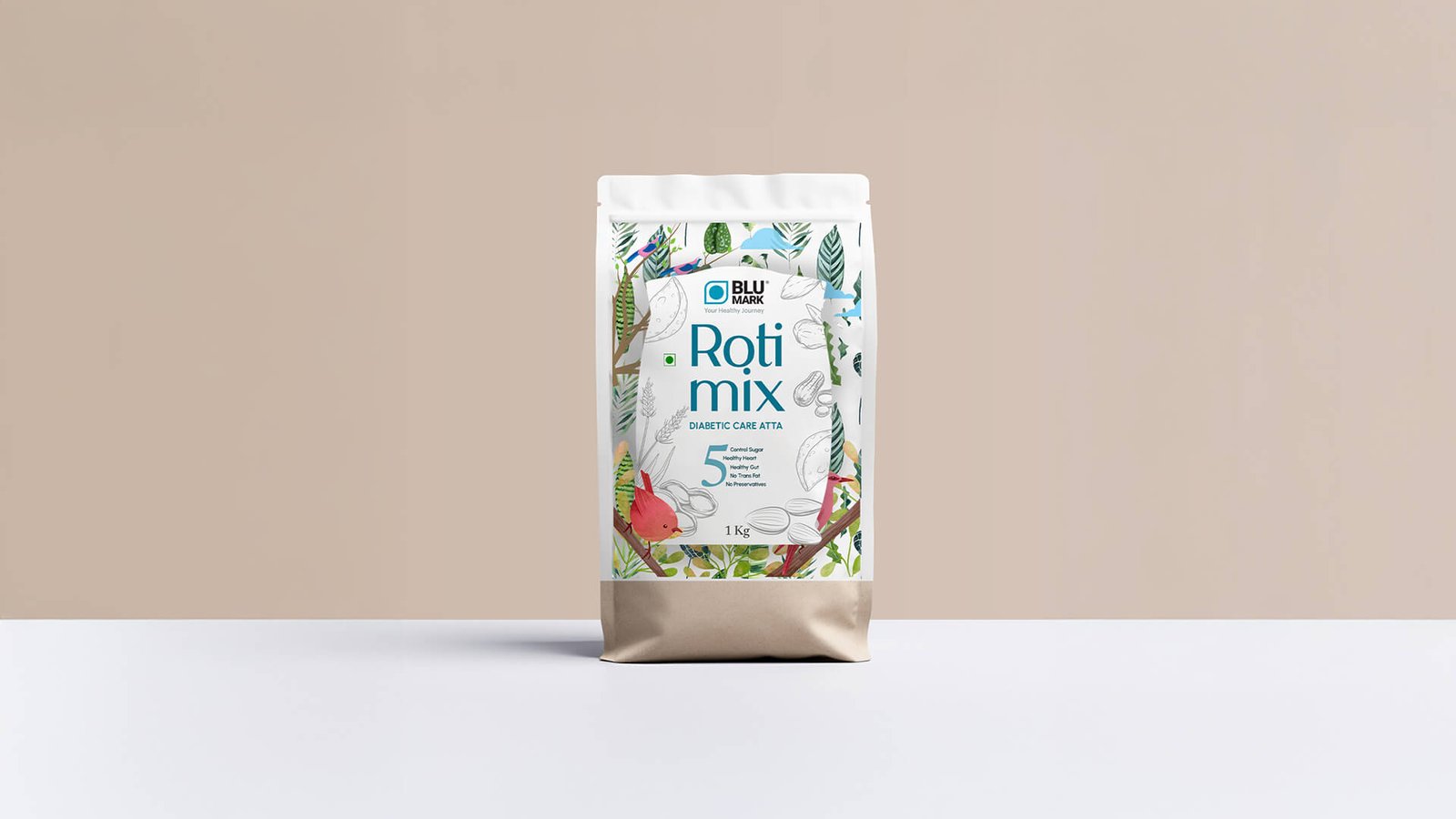 Blu Mark is a modern Ayurvedic brand offering diabetic-friendly atta, and the goal was to refresh its packaging and digital presence to feel natural, warm, and uplifting instead of clinical. Inspired by Nestlé’s nature-led storytelling, the new packaging uses birds, grains, seeds, and ingredient illustrations to create a lively, wholesome visual identity, with a central sack-style motif referencing traditional grain storage.